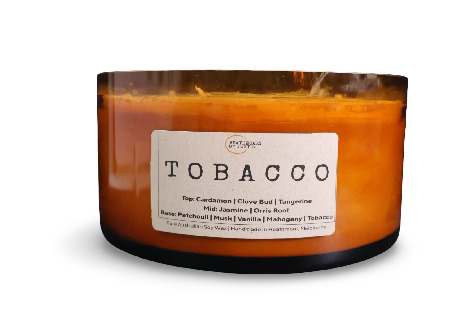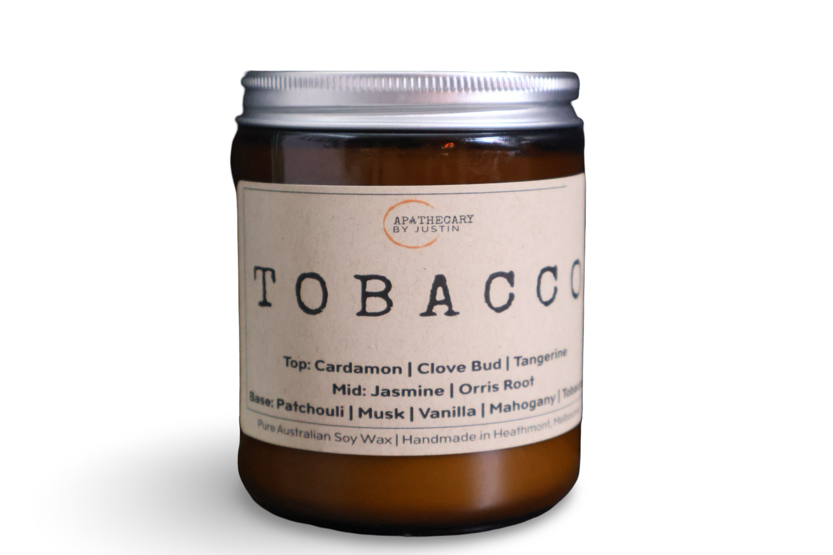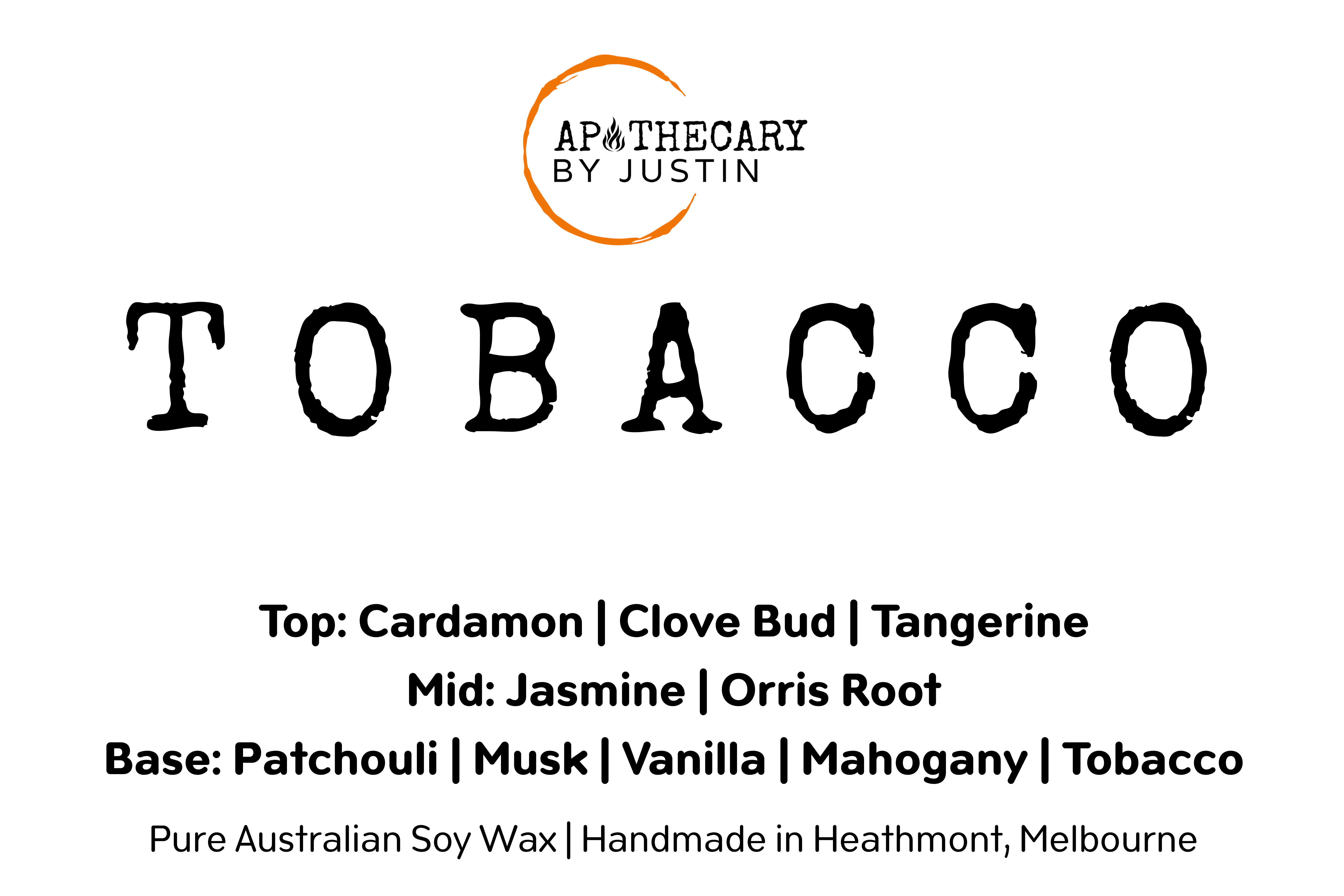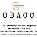 Discover the harmonious blend of scents with the Tobacco Scented Candle from Apothecary by Justin. This hand-poured aroma candle fills your space with a warm, smoky fragrance balanced by jasmine and vanilla.