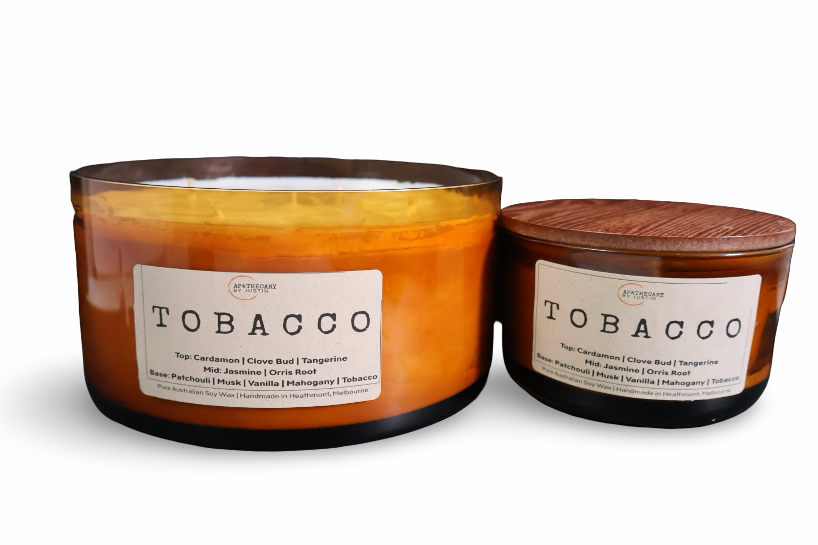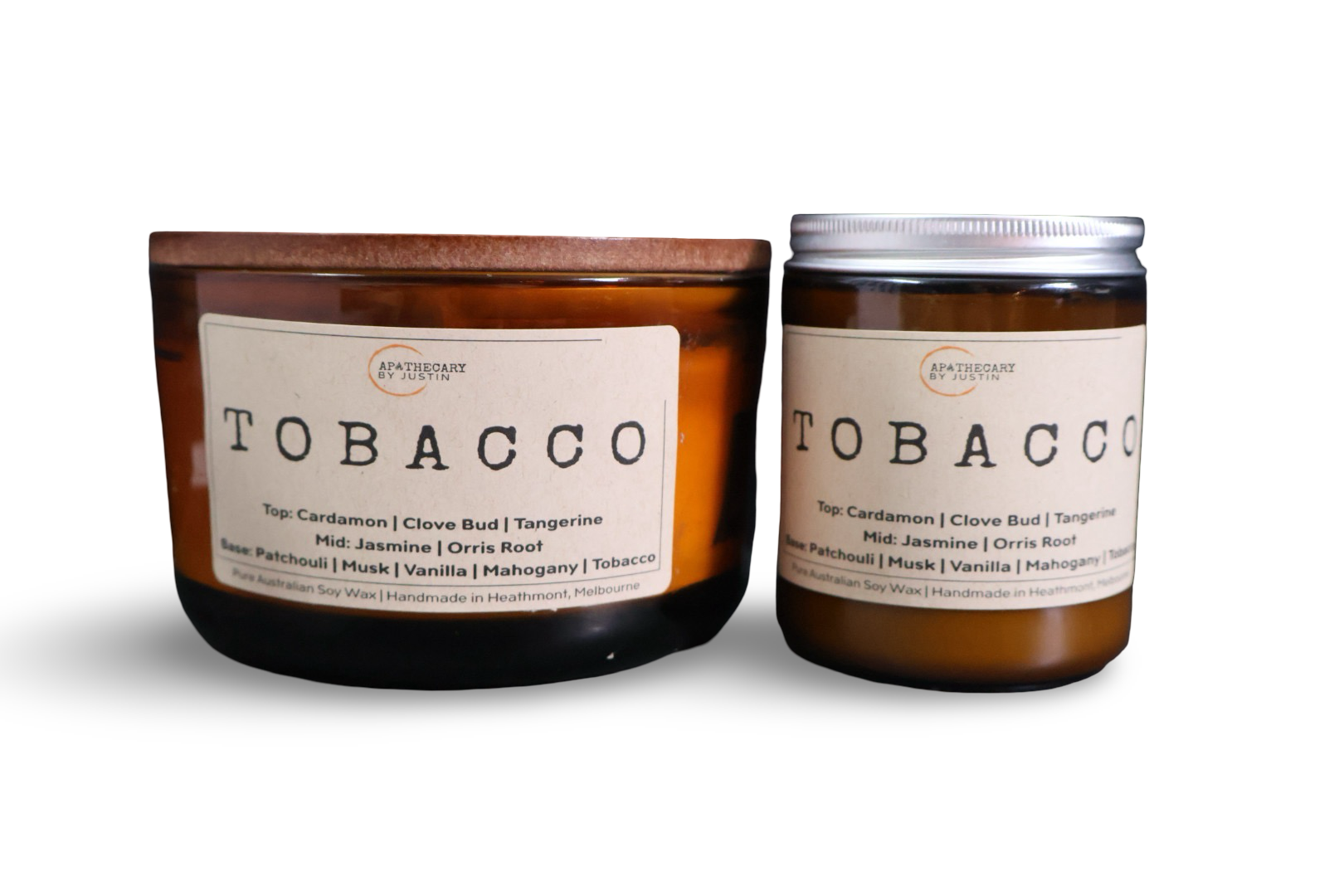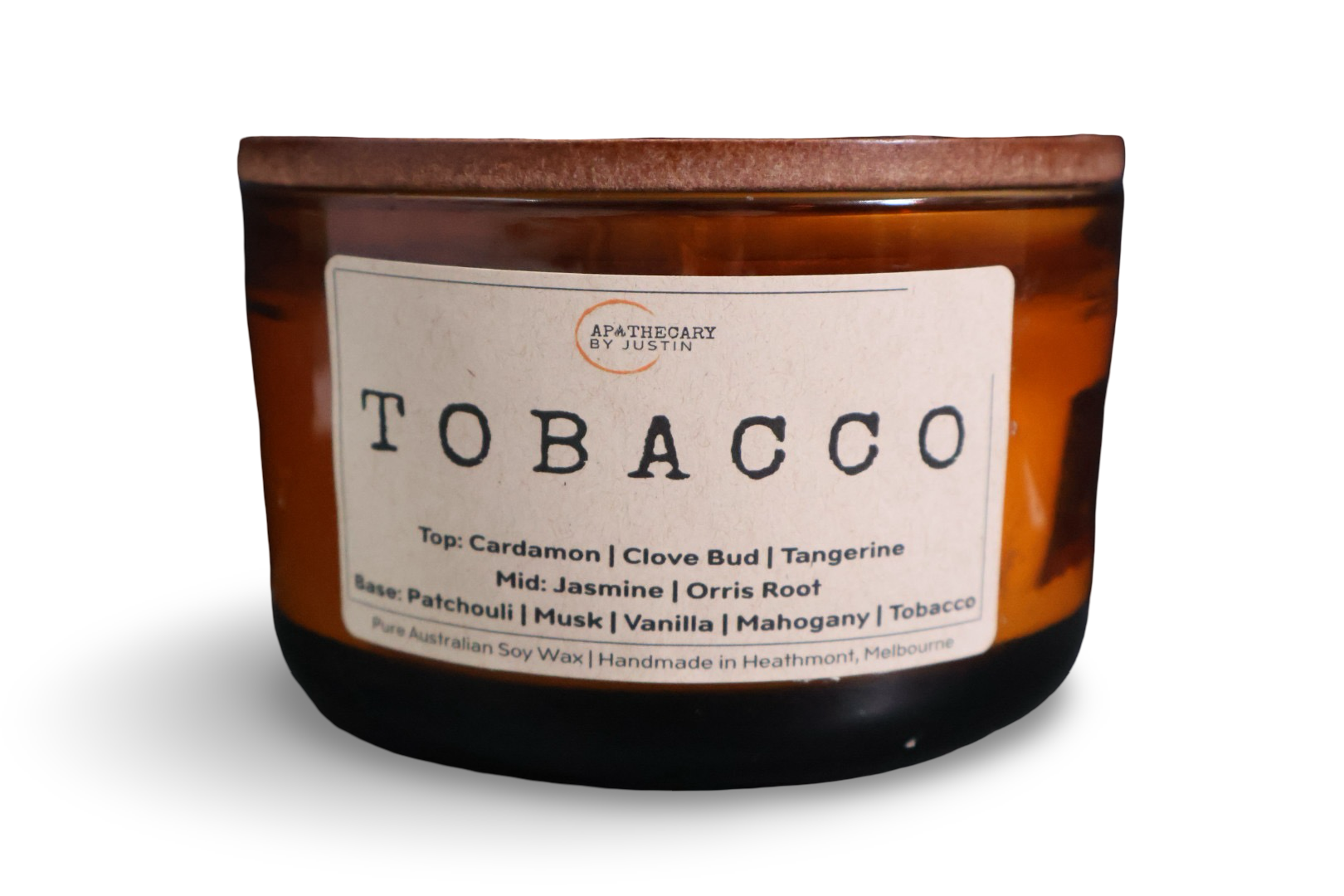 Discover the harmonious blend of scents with the Tobacco Scented Candle from Apothecary by Justin. This hand-poured aroma candle fills your space with a warm, smoky fragrance balanced by jasmine and vanilla.