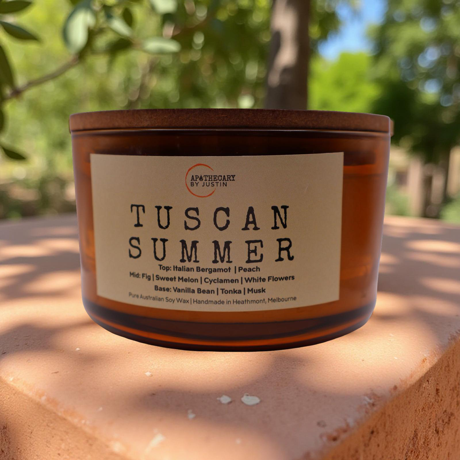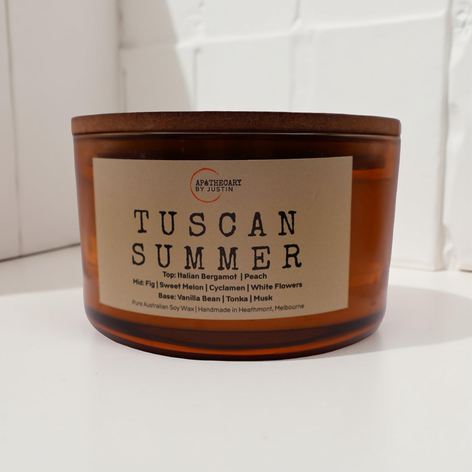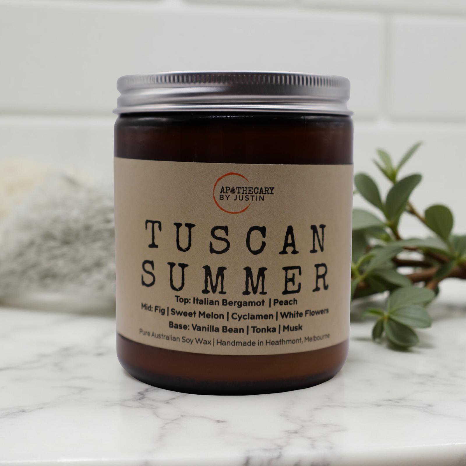 Escape to the sun-drenched landscapes of Italy with Tuscan Summer, a luxury scented candle handcrafted in Australia. This elegant fragrance opens with crisp bergamot, creamy peach, and sweet melon, creating a refreshing and inviting ambiance. As the scent unfolds, a heart of juicy fig, cyclamen, and delicate white flowers adds warmth and sophistication. The base notes of vanilla bean, tonka, and fruity musk deliver a smooth and comforting finish, filling your space with a long-lasting and enchanting aroma. Perfect for adding a touch of elegance to your home, Tuscan Summer transforms any room into a relaxing Tuscan retreat.
