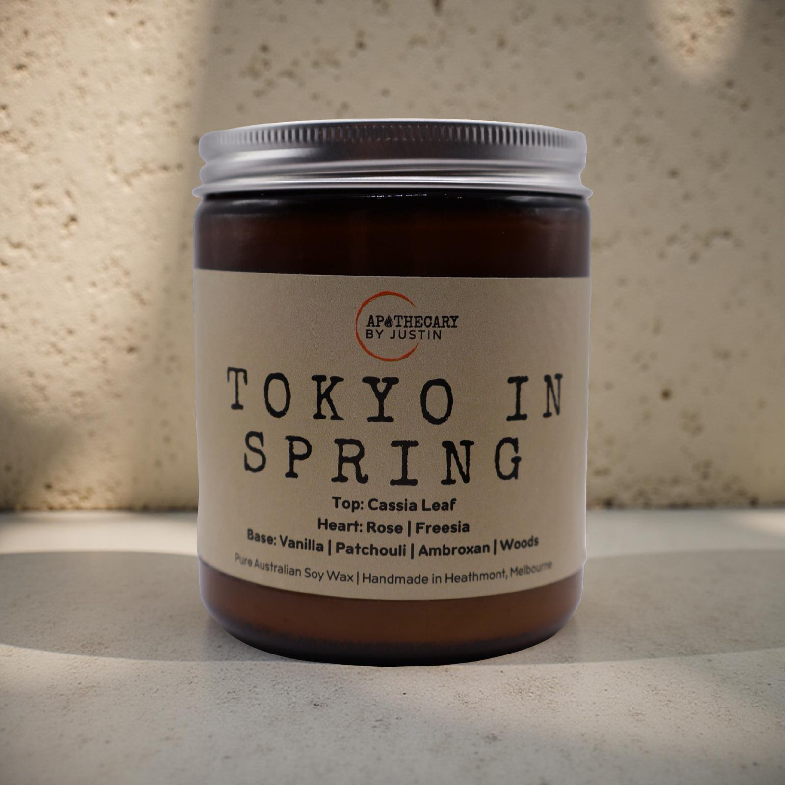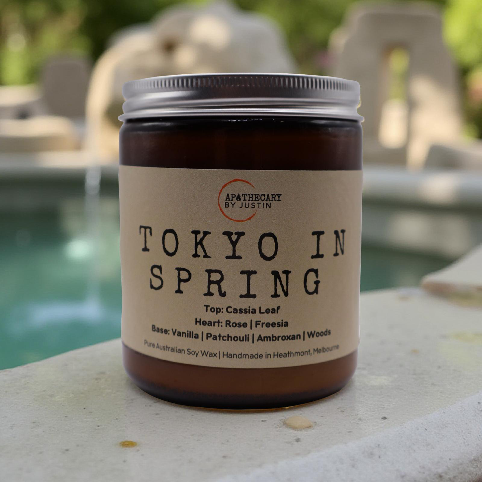 The candle's base notes ground the fragrance in warmth and depth. Creamy vanilla adds a comforting, indulgent sweetness, while patchouli introduces an earthy richness. The addition of ambroxan—known for its musky, amber-like qualities—and a blend of woods lend an elegant, sophisticated finish, evoking the serene beauty of a springtime stroll through Tokyo's parks.